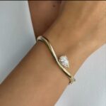 Sleek gold -toned cuff bracelet featuring a graceful curved design and sparkling pear-cut stone. A modern statement peace for effortless everyday elegance.